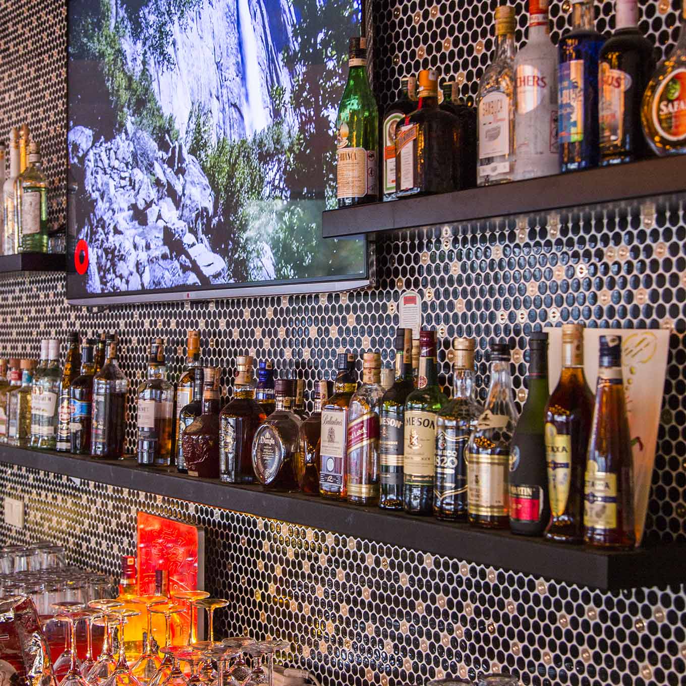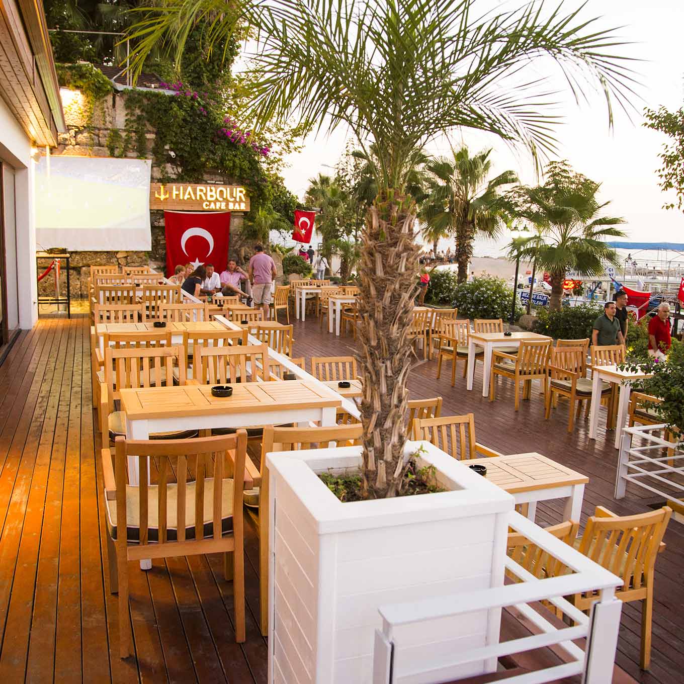 Restoranın iki kapalı binasından biri, 60 m²’lik Harbour Bar’dır. Bu alan, restoranın aksine, daha rahat bir tasarıma sahip olup, cafe olarak kullanılmaktadır. Duvarlarda antik aynalar ve görsellerin yer aldığı bu mekânda, oturumlar daha rahat bir biçimde düzenlenmiştir. Büyük, oval şekilli bar ise modern ve şık bir formda tasarlanmıştır. Cam mozaik yerine siyah mozaik kullanılarak, atmosferin daha sade ve sofistike hale getirilmesi sağlanmıştır. Kışın da kullanılan bu barın hemen yanında, kazı sırasında bulunan tarihi duvarlar sergilenmektedir.