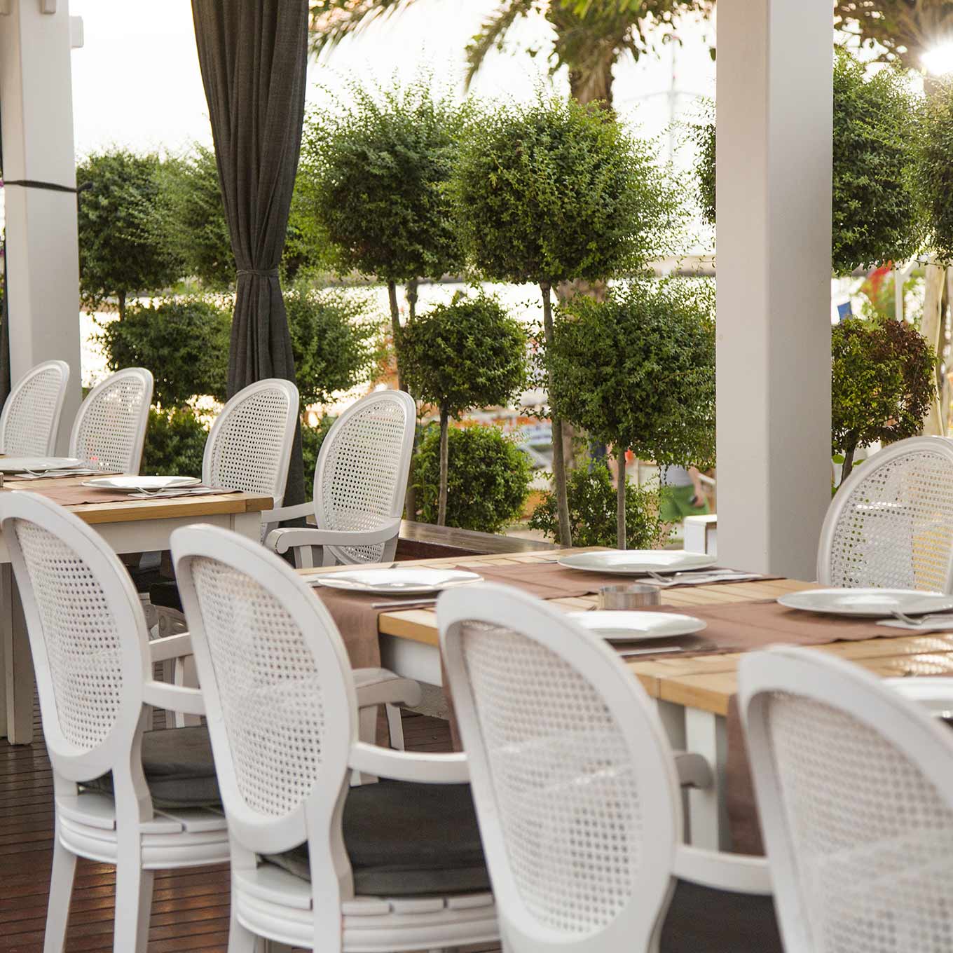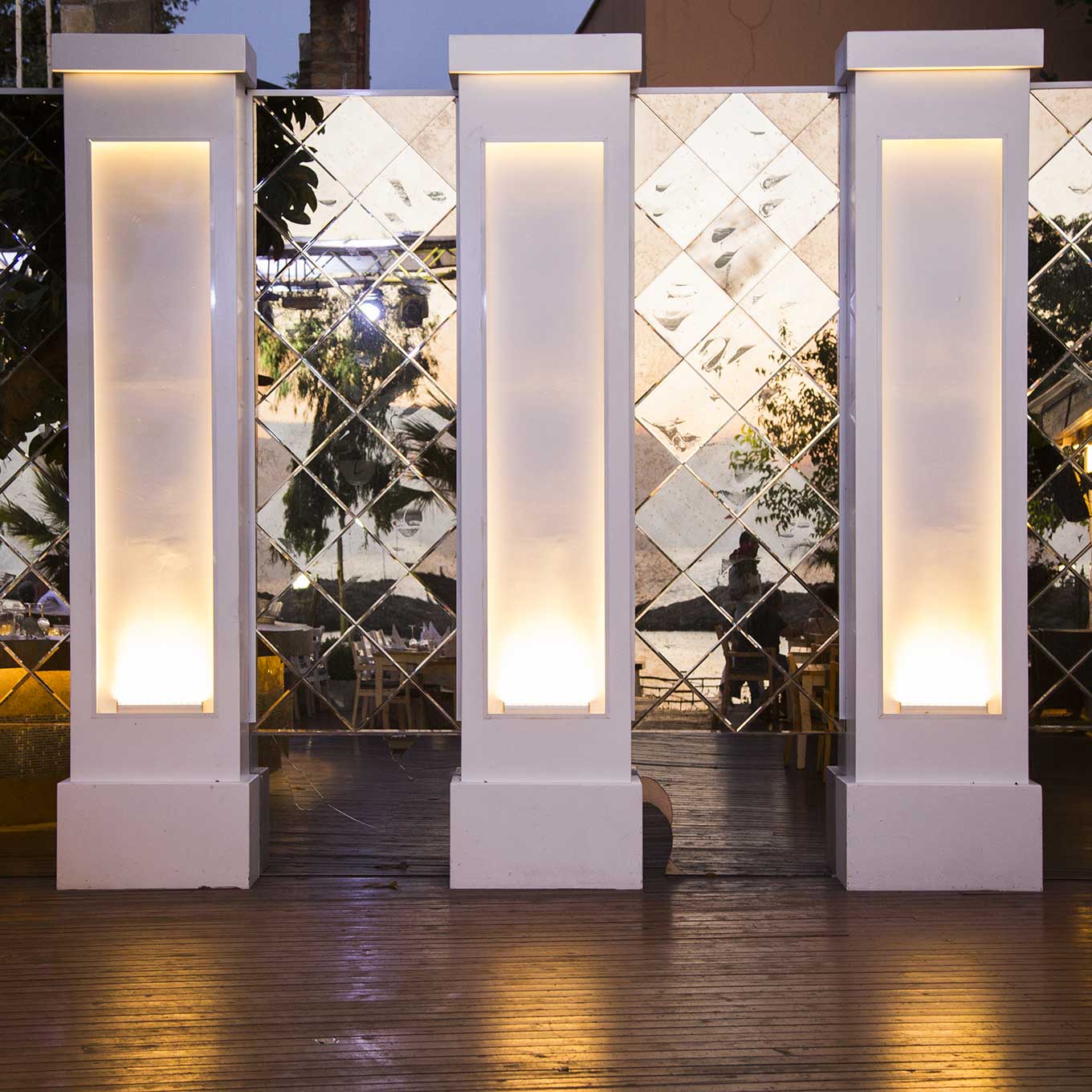 Restoranın görsel bütünlüğünü sağlayan bir diğer önemli unsur ise pergolelerdir. Hem güneşten koruma hem de mekânın estetiğini zenginleştiren pergoleler, restoranın açık alanına hareket kazandıran tasarım ögelerindendir. Zeminde yapılan kot farklılıkları ve üzerine yerleştirilen üç pergole, burada konforlu oturma gruplarının yer aldığı özel alanlar oluşturmuştur. Gündüzleri kalabalık gruplar için uygun bir alan sunan bu pergoleler, gece ise bir club atmosferine dönüşerek loca olarak kullanılmaktadır. Pergolelerdeki spot ışıklarla aydınlatmalar gece ortamını özel kılarken, zemine serilen kandiller mekânın şıklığını tamamlamaktadır.